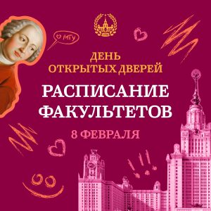 8 февраля состоится День открытых дверей МГУ. Вас ждет презентация программ бакалавриата, специалитета и магистратуры в Главном здании и на факультетах. Также в программе – выставка факультетов, лекция ректора МГУ академика Виктора Садовничего и другие активности.