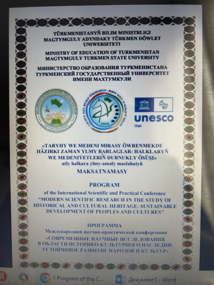 Туркменский государственный университет имени Махтумкули, кафедра ЮНЕСКО «Культурное наследие: от прошлого к будущему» 15-16 апреля 2026 года планирует проведение международной научно-практической конференции «Современные научные исследования в изучении историко-культурного наследия: устойчивое развитие народов и культур»  по случаю года «Независимый, нейтральный Туркменистан – родина целеустремленных крылатых скакунов», 35-летия Независимости Туркменистана, а также Международного дня всемирного наследия при участии профессорско-преподавательского состава, ученых, научных сотрудников, аспирантов, магистрантов и докторантов высших учебных заведений,   научно-исследовательских учреждений, представителей кафедр и клубов ЮНЕСКО Туркменистана и зарубежных стран, а также представителей Ассоциированных школ ЮНЕСКО.